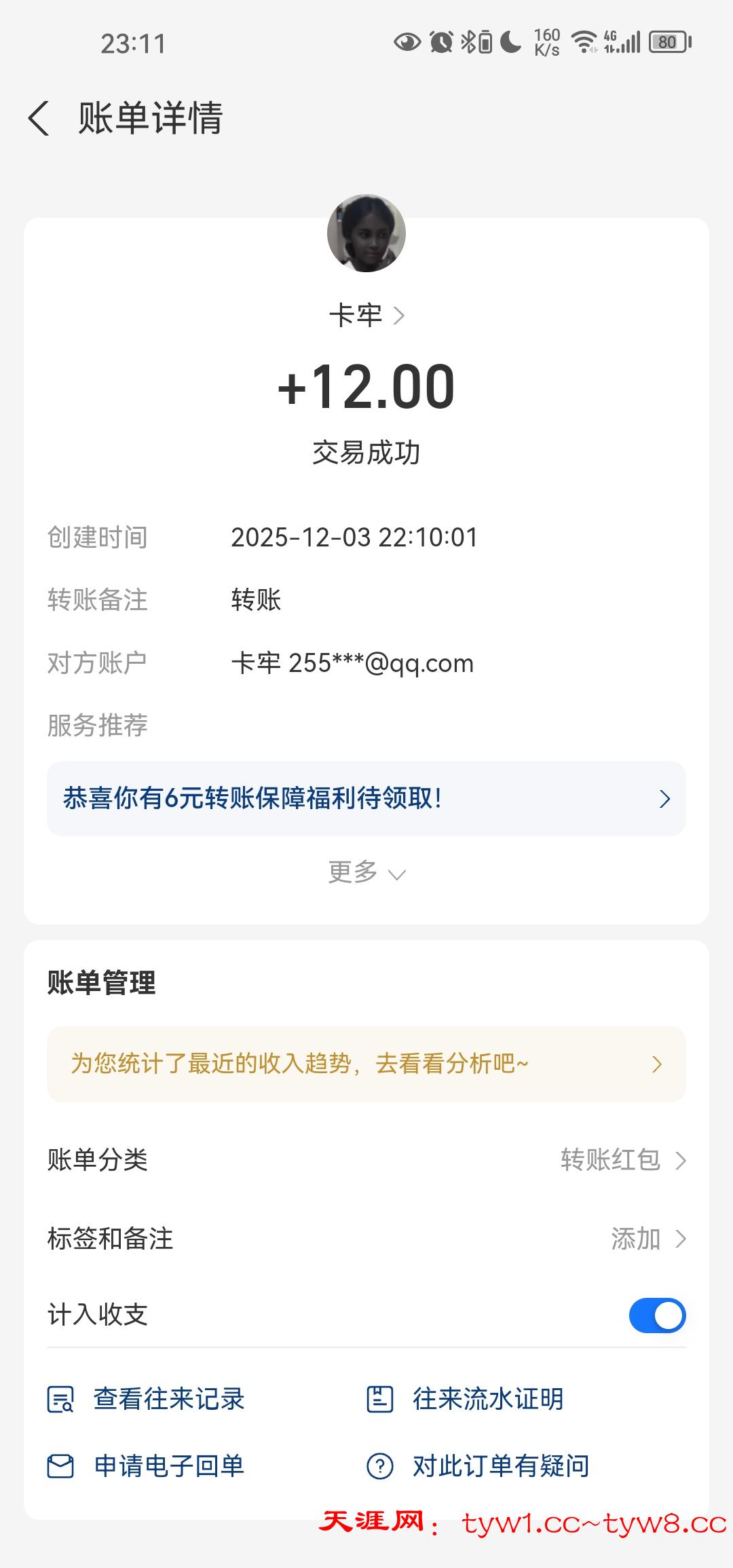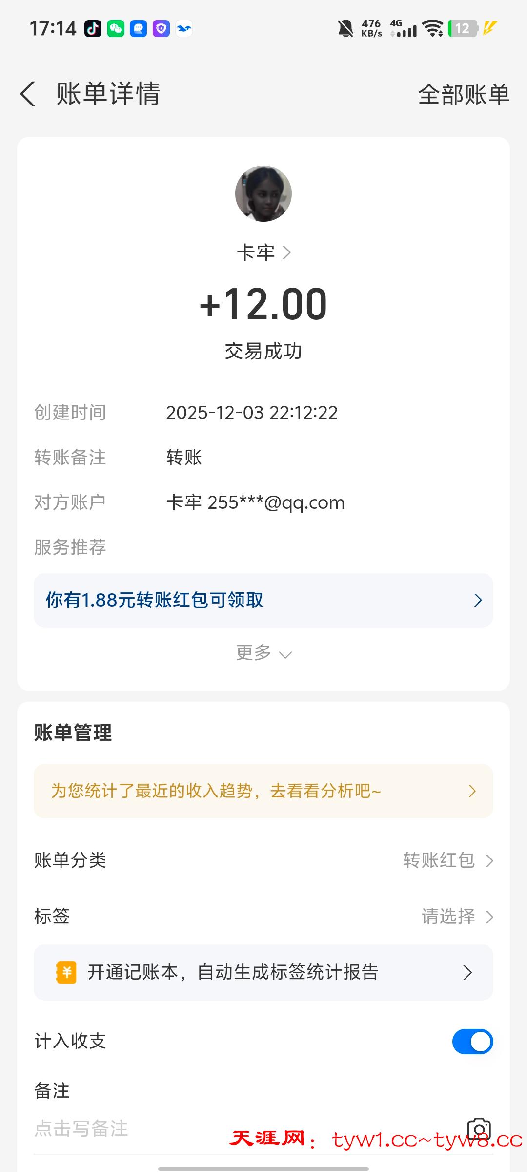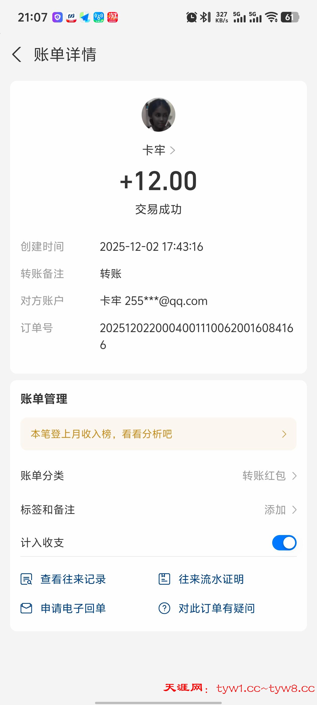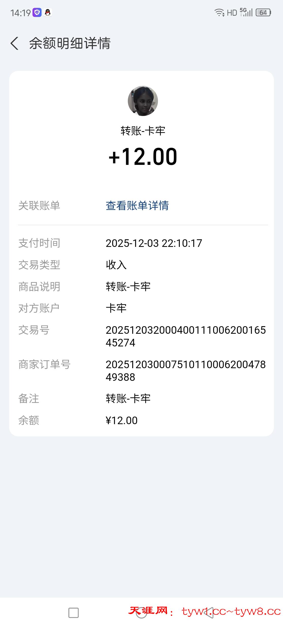 12.3到账,感谢天涯。