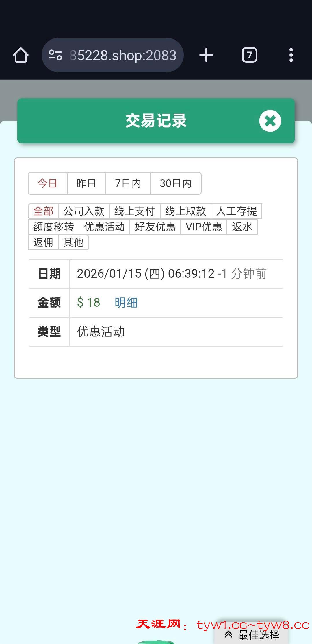点了个新葡京本来想注册碰瓷的,结果有账号登录后找客服申请回访彩金。就提供了账号也没查手机 送了18彩金 满188提款 只能指定钱包提款。我没打出来。