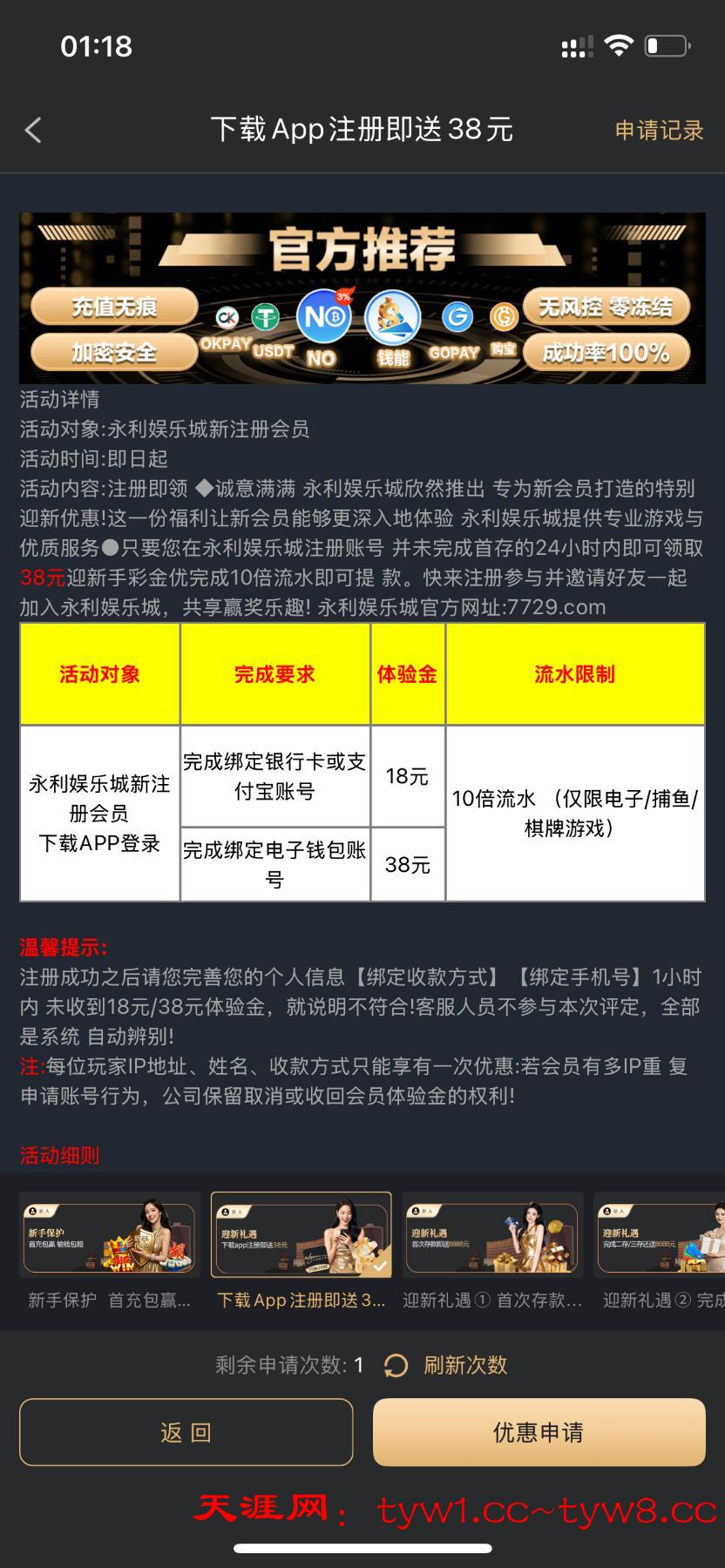 新人注册领18+38。 我是老号没领到。 没号的可以去试一下。我是老号玩过出款没问题,禁止充值。白嫖就好