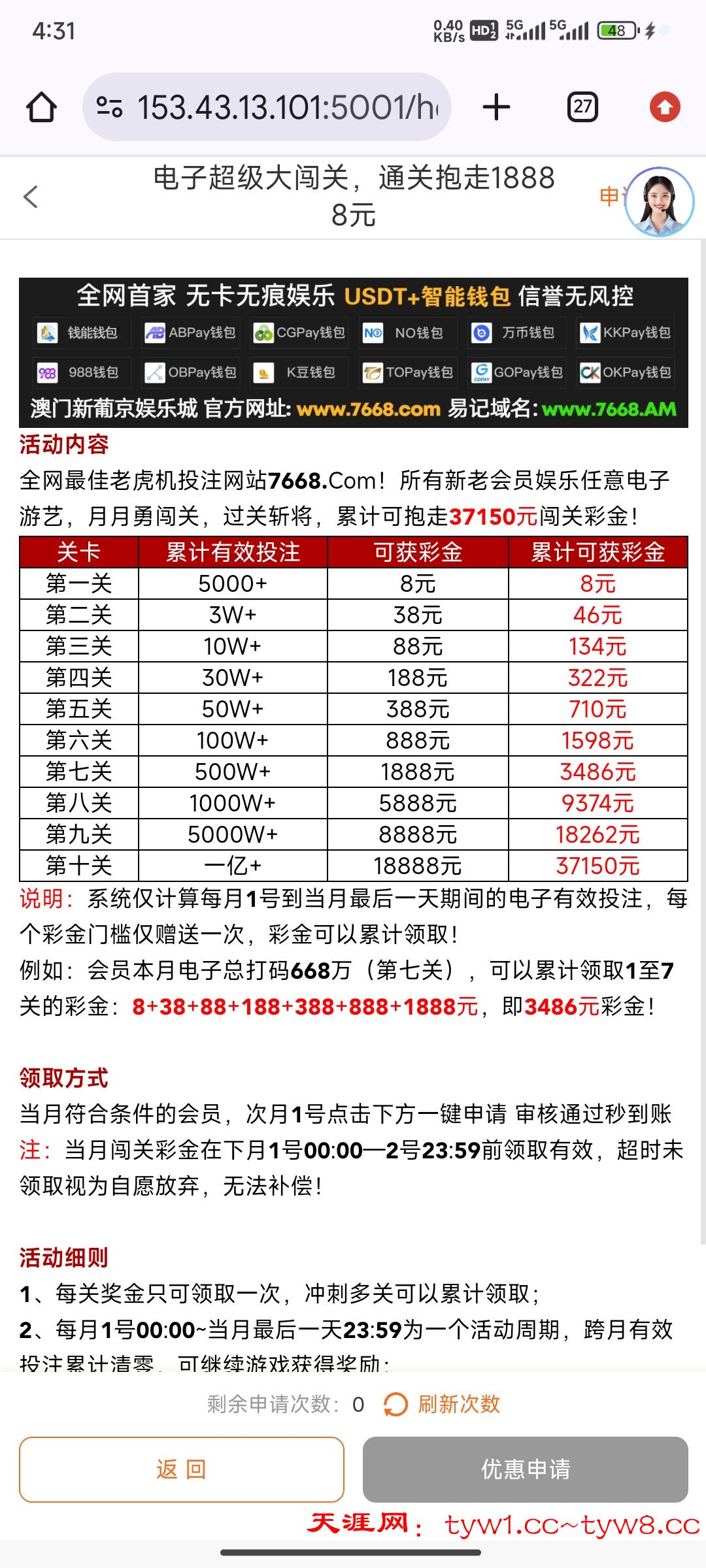 新出了几个活动,日投注,周投注,月投注彩金,在电子活动最下面,很难发现,上个月玩过的这个月快去申请,今天月投注申请最后一天