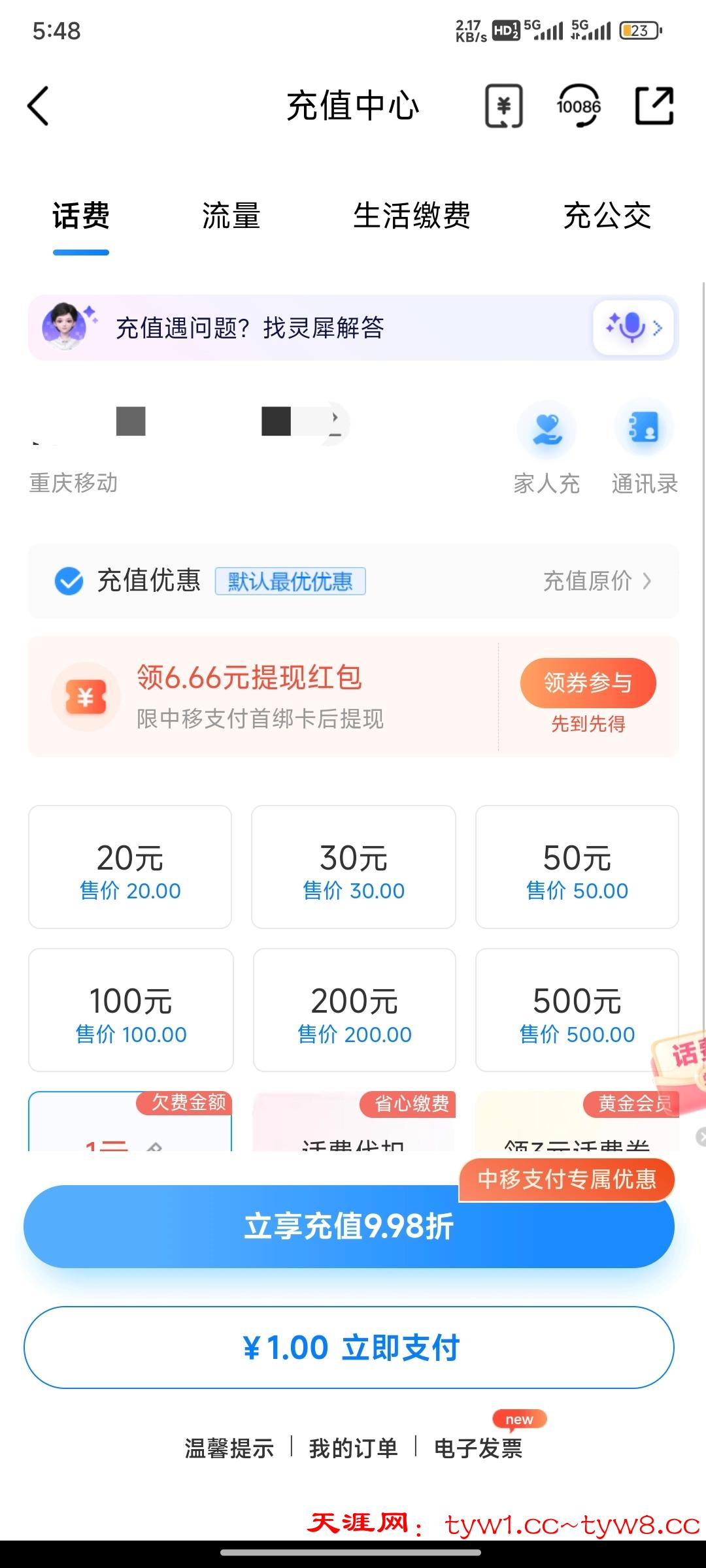 用移动卡的快去,先到先得6.66红包 点话费充值那里