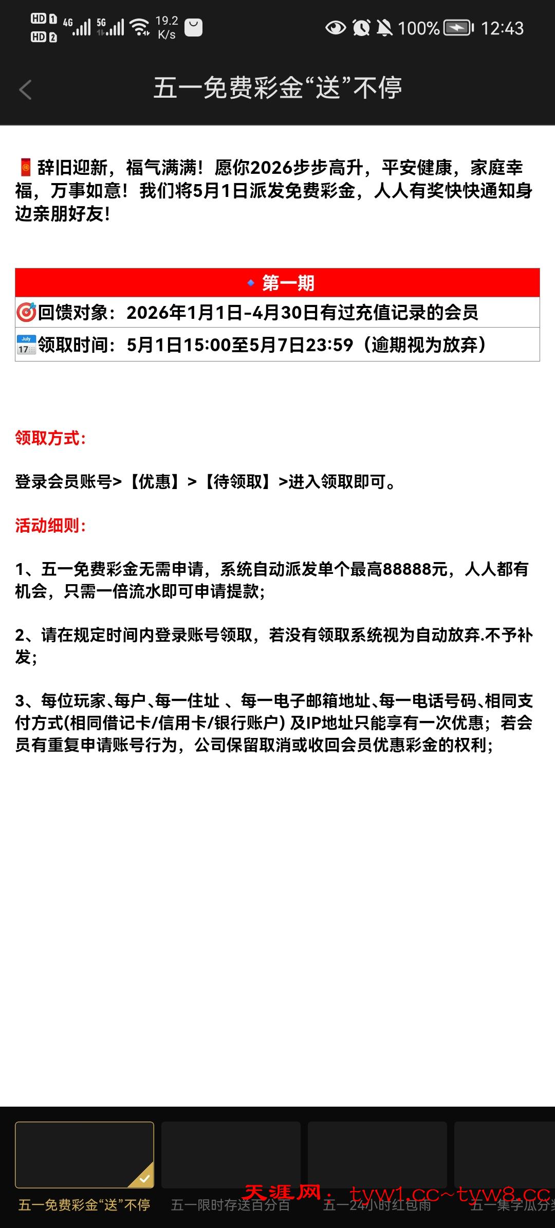 五一免费彩金无需申请,系统自动派发单个最高88888元,人人都有机会,只需一倍流水即可申请提款;